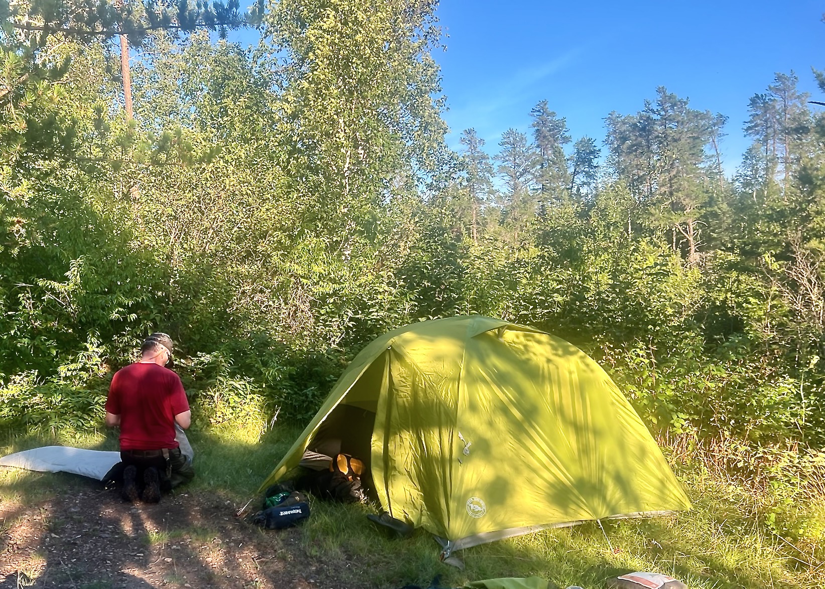 Shortly after launching on Ottertrack, we made camp on the US side of the lake, at around 16:30. Compared to the sites in Quetico, this one is notably more heavily used—and comes equipped with obnoxious and aggressive chipmunks that we repeatedly shoo away from our gear.